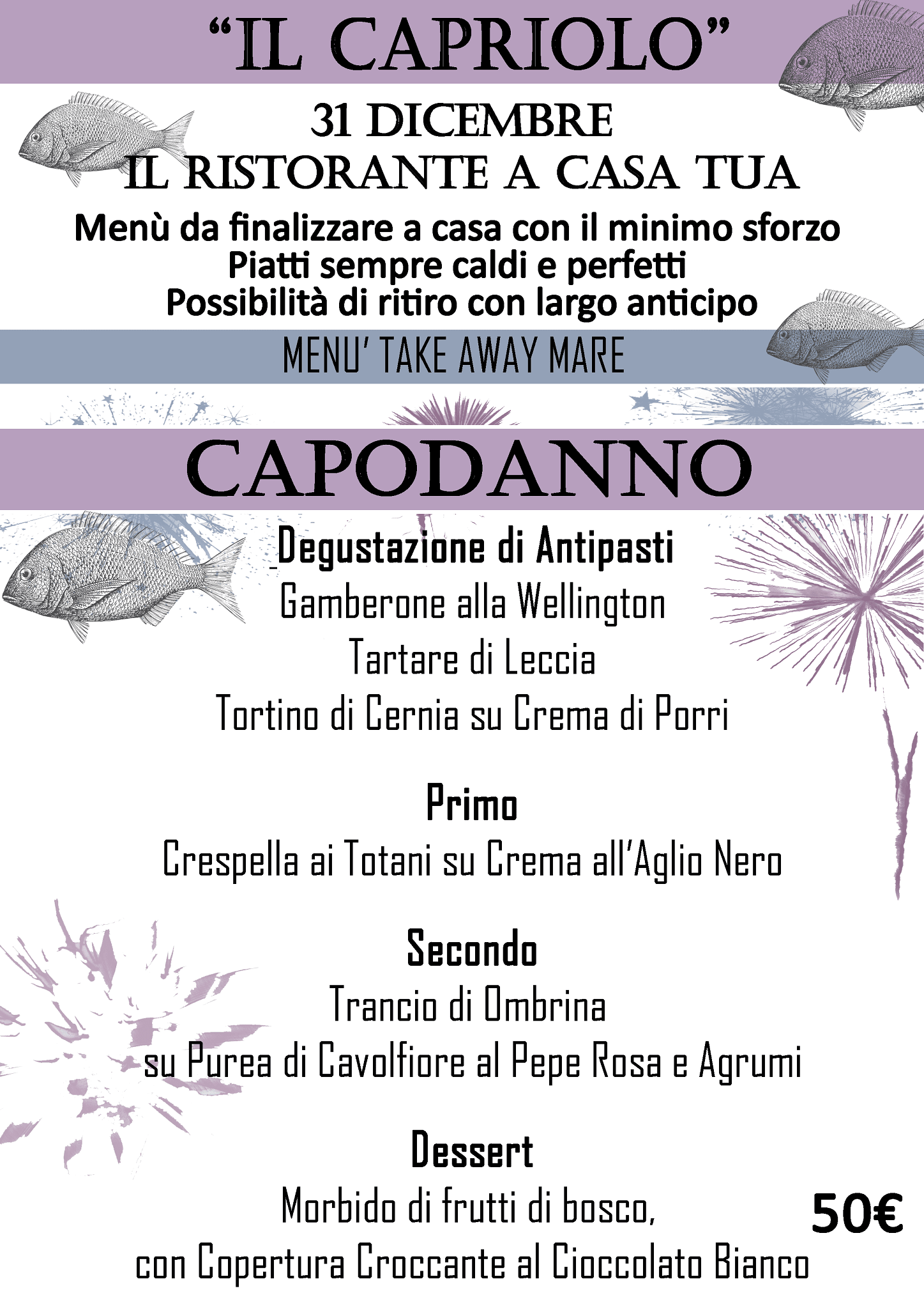 Resta attivo il servizio di asporto per il 31 Dicembre, con il menù del cenone da rigenerare a casa.