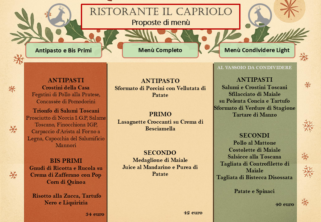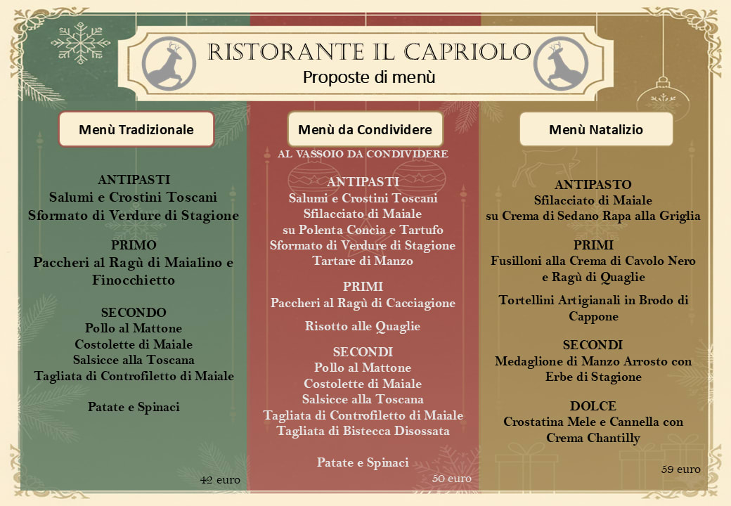 Il Ristorante Il Capriolo di Prato propone menù dedicati ai gruppi numerosi per il periodo natalizio e non solo. Sono perfetti per cene aziendalicene di compleanno, ritrovi tra amici, famiglie e associazioni. Le nostre proposte sono pensate per garantire un’esperienza piacevole, conviviale e organizzata nei dettagli, con piatti di carnepesce e dolci artigianali fatti in casa.