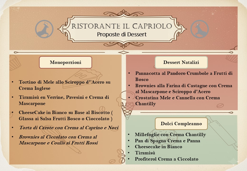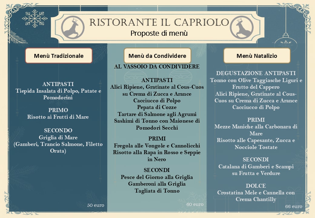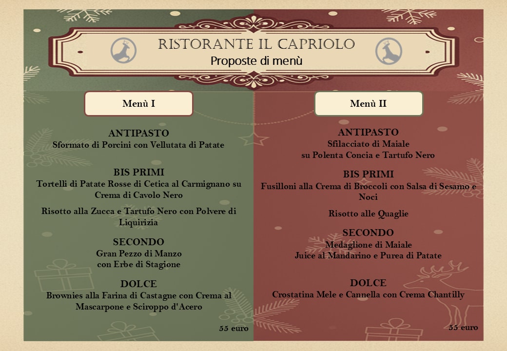 Il periodo delle feste è l’occasione ideale per organizzare una cena aziendale in un ambiente caldo e accogliente. A “Il Capriolo” offriamo menù dedicati alle imprese che desiderano premiare i propri dipendenti, rafforzare i rapporti interni e celebrare insieme i successi dell’anno.